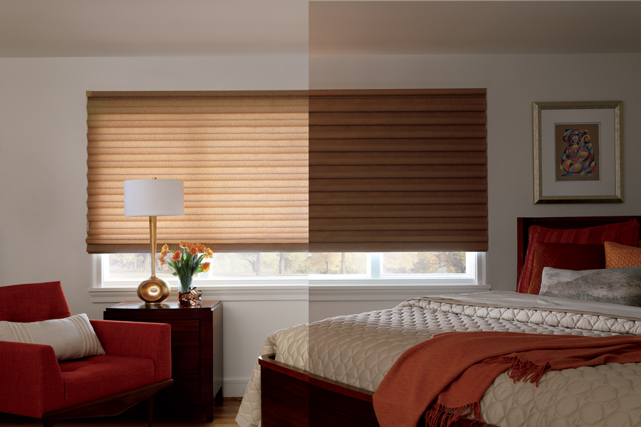 room darkening dual shades on bedroom windows controlled by remote in Rocky River OH